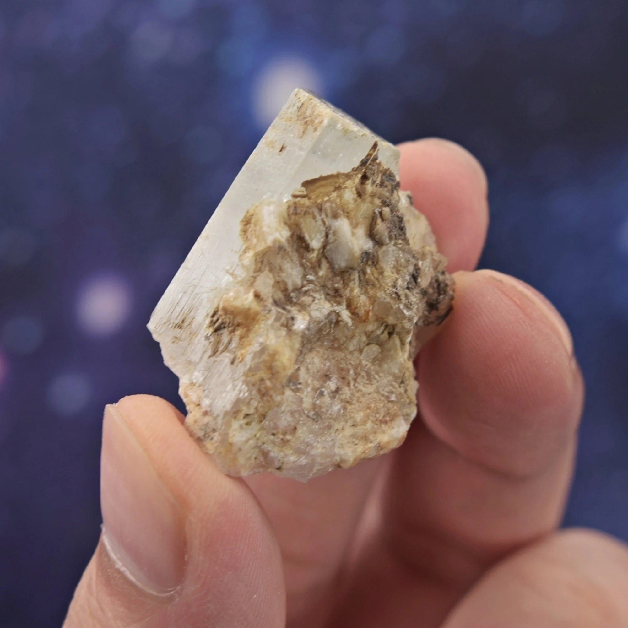 This Pakistani Beryl is partially terminated on one side with some crystalline surfaces, semi etched crystalline, and some raw rough areas. It is semi translucent to translucent with a mixture of very light pale blue Aquamarine color and some very light pale pinkish Morganite colors, and there are some raw minerals attached along parts of its surfaces.